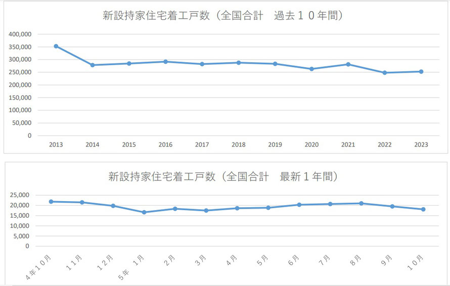 下記のグラフは、全国新設持家住宅着工戸数の過去10年間の経緯と、最新1年間の経緯になります。